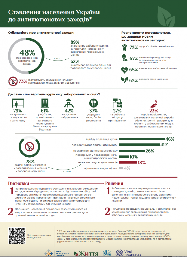Окрім того, респонденти повідомили, що, попри набуття чинності антитютюнових заходів, вони все ще помічають вживання тютюнових виробів у заборонених Законом місцях — приміром, 79% учасників опитування помічали куріння на зупинках громадського транспорту, 61% — у підʼїздах багатоквартирних будинків, а  37% — усередині закладів громадського харчування. Проте українці готові захищати своє право на бездимне середовище — близько 80% опитаних зазначили, що вжили б певних заходів у разі виявлення куріння у забороненому місці. Зокрема, більше половини діяли б проактивно: попросили б курця припинити курити або поскаржилися б адміністрації закладу чи правоохоронним органам.