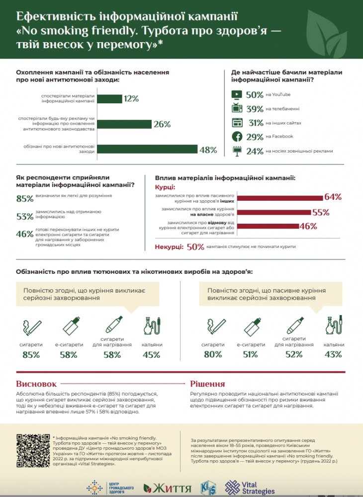 Опитування проводилося за підсумками інформаційної кампанії “No smoking friendly. Турбота про здоров’я — твій внесок у перемогу”, реалізованої Центром громадського здоров’я та ГО “Життя” протягом жовтня — листопада 2022 року за підтримки міжнародної неприбуткової організації “Vital Strategies”.